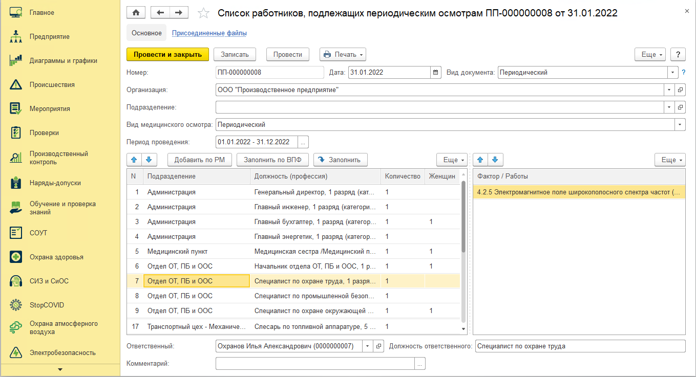 Специалисту по охране труда — контроль травматизма, заболеваний, состояния здоровья сотрудников; расследования несчастных случаев; проверки; учет нарядов-допусков, нормативно-технической документации; обеспечение работников СИЗ и СиОС; отчетность по результатам СОУТ.