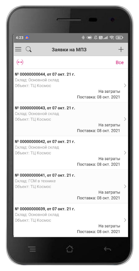 В заявках отображается информация об объекте строительства, на склад которого планируется закупить и доставить материалы. Дата в списке документов является планируемой датой поставки. Пользователь может просматривать существующие заявки и создавать новые.
