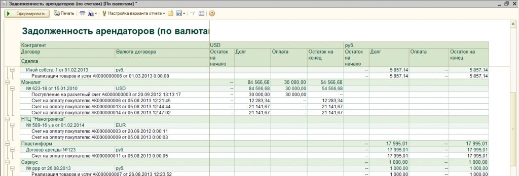 Данные в режиме on-line о свободных площадях, дебиторской задолженности арендаторах, действующих договорах