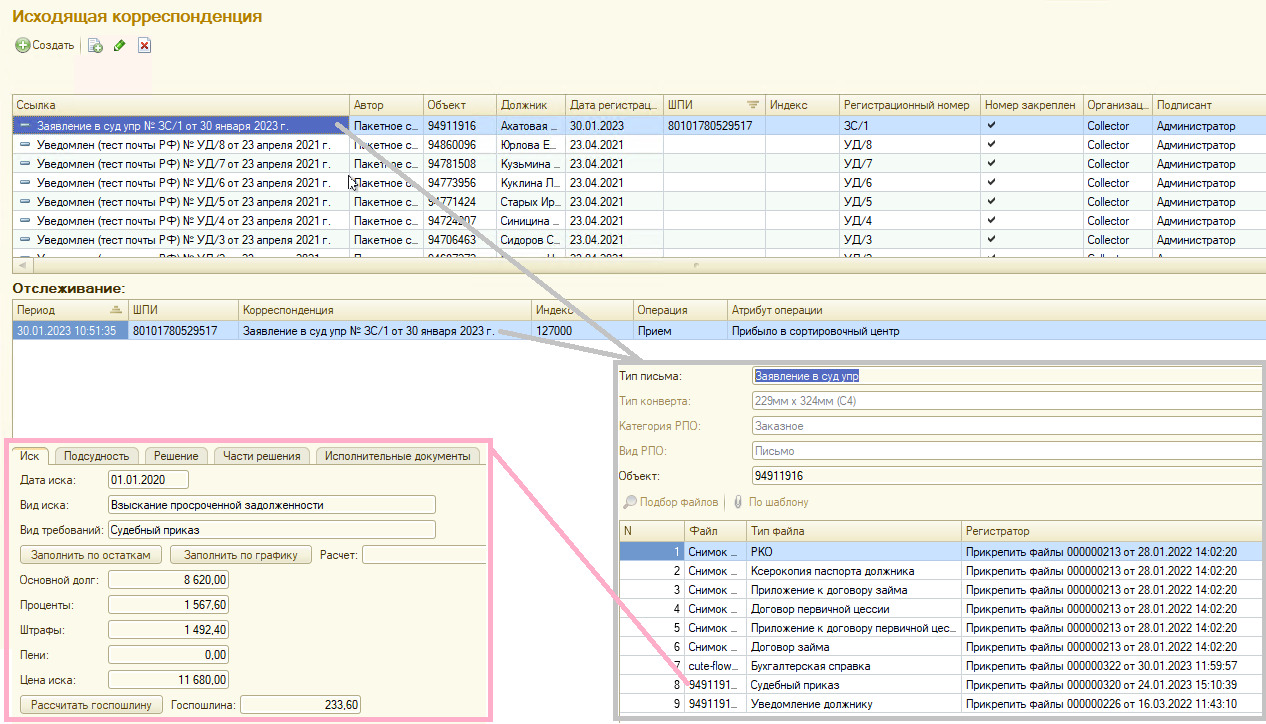 • Интеграция с Почта РФ ускорит процесс судебного взыскания благодаря автоматическому контролю статусов по всем отправленным письмам