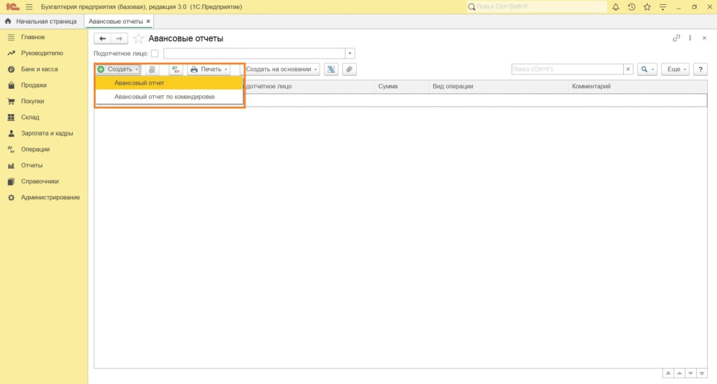 Приступаем к созданию авансового отчета в 1С Бухгалтерия.