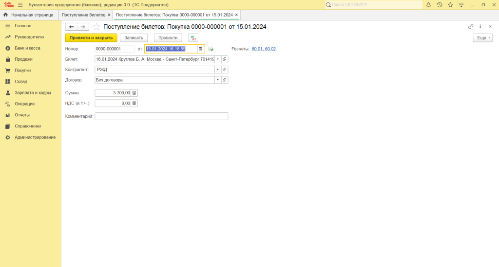 15.01.2024 – куплен электронный билет на поезд за 3700, 14.01.2024 оплачено с расчетного счета.