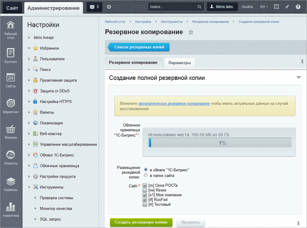 Для сайта на базе 1С-Битрикс процесс тоже несложный: заходим в панель администрирования и переходим «Настройки → Инструменты → Резервное копирование → Создание резервной копии». А дальше можем сохранить бэкап либо локально на компьютере, либо в облачном хранилище 1С-Битрикс. Подробнее можно почитать в отдельной статье.