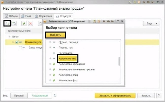 Для этого снова нужно произвести некоторые настройки в отчете «План-фактный анализ продаж». Во вкладке «Структура» выберите расширенный вид настройки. Далее нужно отключить группировку «Заказы покупателей» (Рис 7), а затем добавить группировку «Характеристика». (Рис 8) После чего сформировать отчет.  (Рис 9)