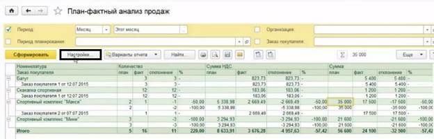 Открываем раздел «Анализ», выбираем отчет «План-фактный анализ продаж» и формируем его. Если не производить никаких дополнительных настроек, то данные будут показаны по умолчанию (Рис 5). Отчет содержит: