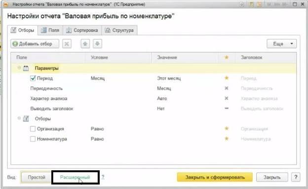 В разделе «Анализ» используется отчет «Валовая прибыль по номенклатуре». Нам потребуется не стандартный вариант отчета, поэтому откроем «Настройку» и выберем «Расширенный» вид. (Рис 11)