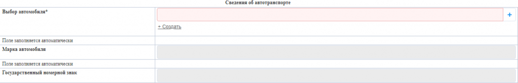 В случае выбора значения «Такси» в поле «Вид перевозки», для заполнения будут предоставлены группа полей «Сведения об автотранспорте»: