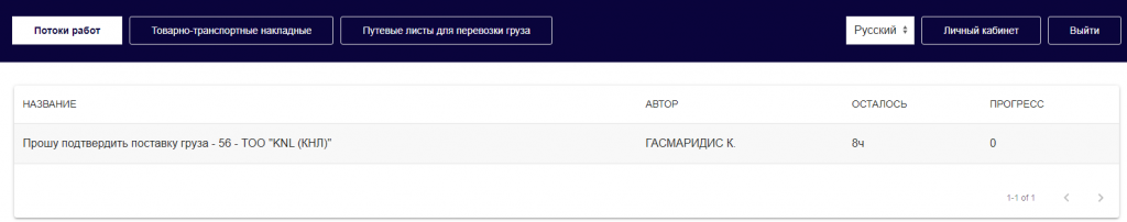 3. После согласования со стороны грузоотправителя, документ вновь вернется в потоки работ сотрудника, указанного в поле «Подписант» в блоке выбора организации грузоотправителя на форме ТТН. При входе в систему соответствующим сотрудником грузоотправителя, на странице «Потоки работ» будет отображена задача с названием «Прошу сделать отметку о прибытии и убытии автотранспортного средства (Действия грузоотправителя) - ТТН – <номер ТТН>»: