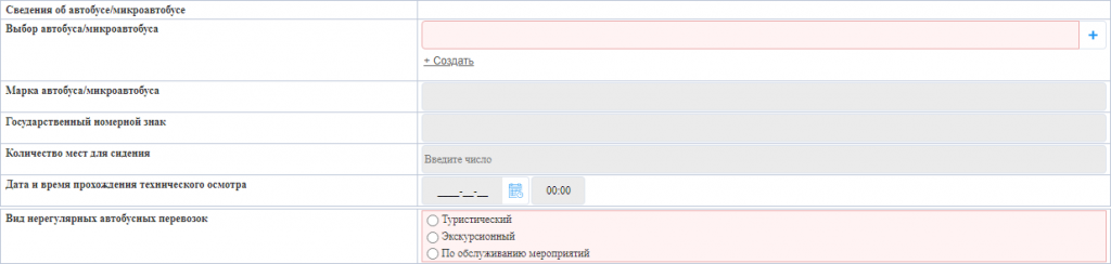 В случае выбора значений «Нерегулярный» или «Регулярный» в поле «Вид перевозки», то для заполнения будут предоставлены группа полей «Сведений об автобусе/микроавтобусе»: