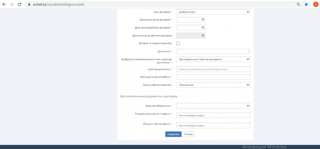 Далее в открывшемся окне заполняем поля. ФИО работника подтягивается автоматически при вводе ИИН, так как система интегрирована с госорганами.