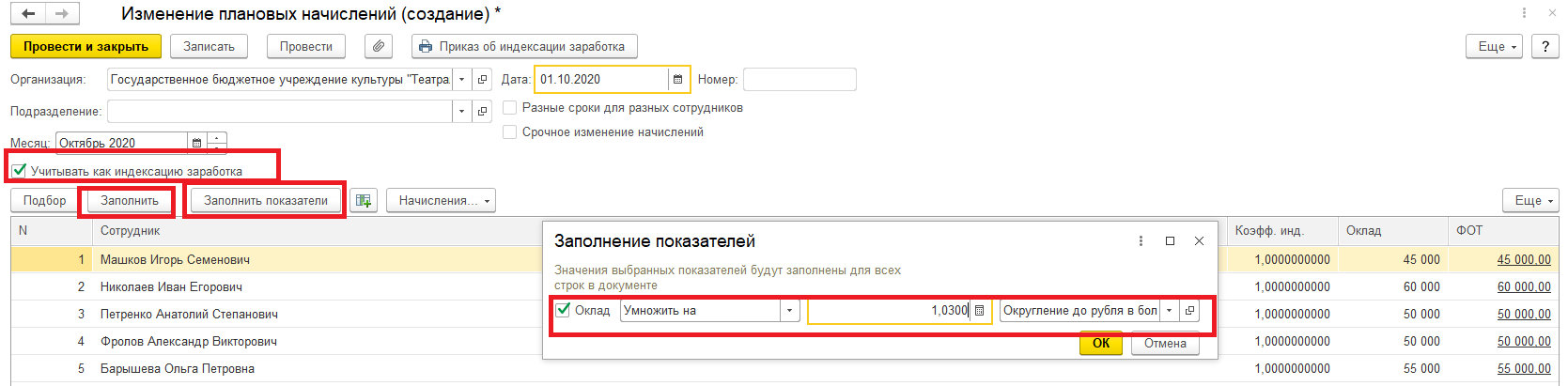 Проведя этот документ: со времени корректировки файла будут зарегистрированы изменения величины плановых начислений сотрудникам, проведены записи коэффициентов индексации зарплаты персонала, которые в будущем станут применяться при расчете средней заработной платы работников при расчете сумм командировочных, больничных, отпускных и т.д.