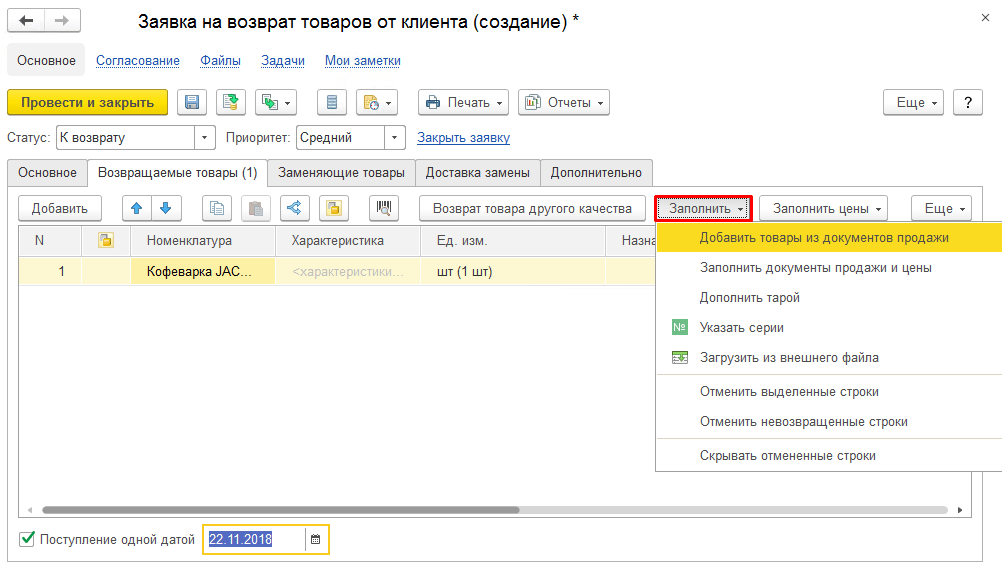 Если заявка на возврат создается без базового документа, то для заполнения списка номенклатуры нужно воспользоваться кнопкой «Заполнить». После ее нажатия открывается список, в котором нужно выбрать «Заполнить документы продажи и цены» либо «Добавить товары из документов продажи».