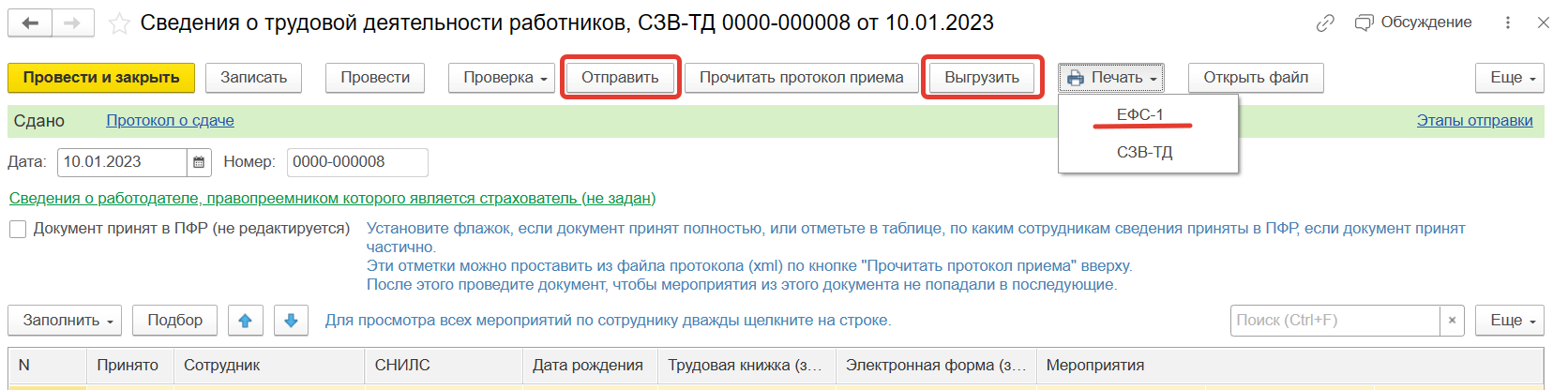 Чтобы отправить отчет в СФР, пользователь нажимает кнопку «Отправить» из формы документа. Чтобы выгрузить и напечатать форму, нужно использовать одноименные кнопки «Выгрузить» и «Печать» на панели отчета.