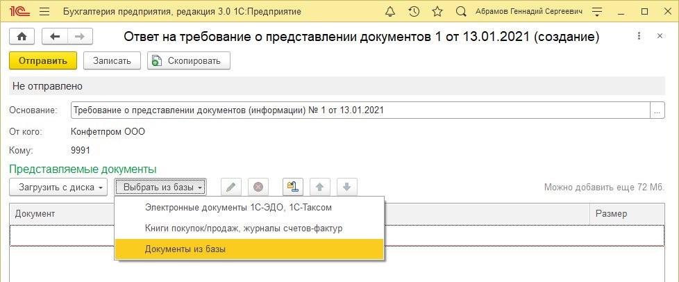 Налогоплательщик также может направить документы в электронном виде, но вправе подать и бумажные варианты (п. 2 ст. 93 НК РФ). Конечно же, электронный вариант для самого налогоплательщика предпочтительнее, т.к. сокращается время ответа на запрос и повышается безопасность подачи документов. Документы в электронном виде можно направлять напрямую из 1С:Бухгалтерия 8 ред. 3.