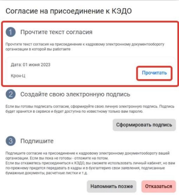 В пункте №1 (рис. 6) сотрудник может скачать согласие и ознакомиться с ним по кнопке «Прочитать». Если сотрудник не готов присоединиться к КЭДО, то он нажимает кнопку «Отказаться».