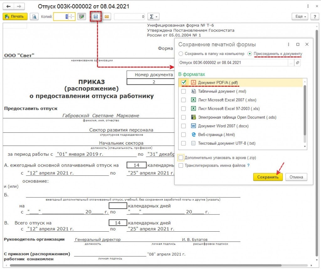 • в форме сохранения печатной формы пользователь ставит переключатель в положение «Присоединить к документу», а затем выбирает нужный формат документа;