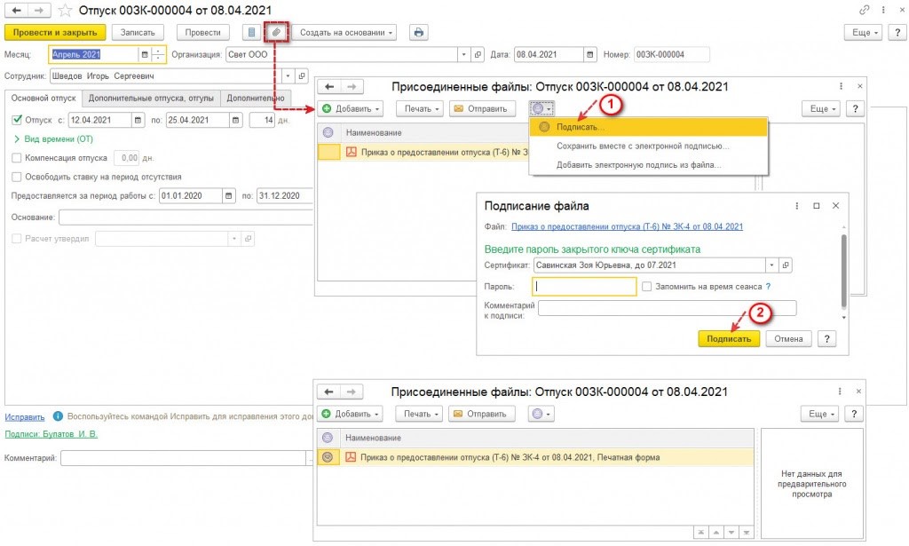 Для подписания приказа электронной подписью в программе проводятся действия: