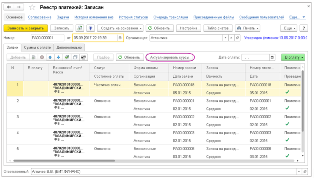 Также возможность актуализации курсов реализована в документе «Реестр платежей». В командную панель табличной части добавлена команда «Актуализировать курсы», которая актуализируют курсы всех Заявок на расходование денежных средств, которые есть в табличной части документа.