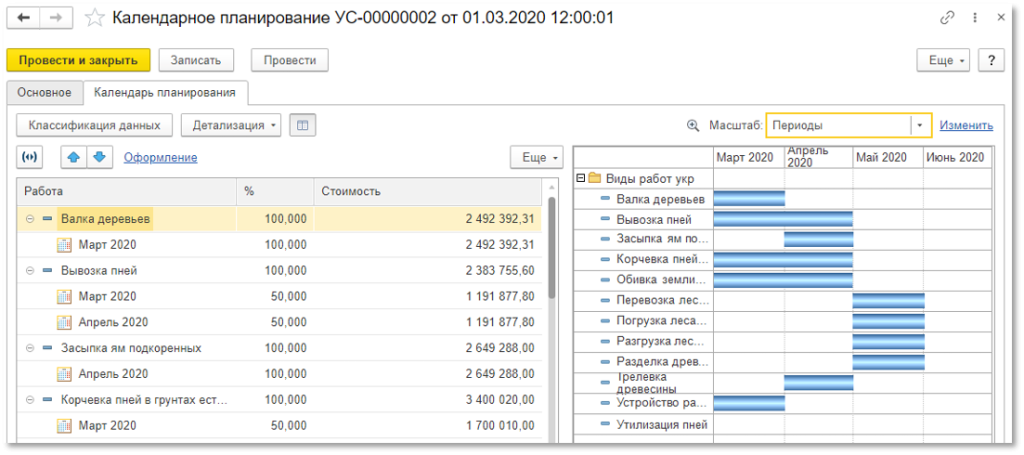 Система позволяет вести планирование по стоимости и объему либо только по стоимости, в том числе делать детализацию по ресурсам. Кроме того, при подготовке плана можно настроить вид классификации, например, планирование по видам работ или по исполнителям. Также программа позволяет представить график работ в виде диаграммы Ганта, который можно настроить по различным параметрам работ.