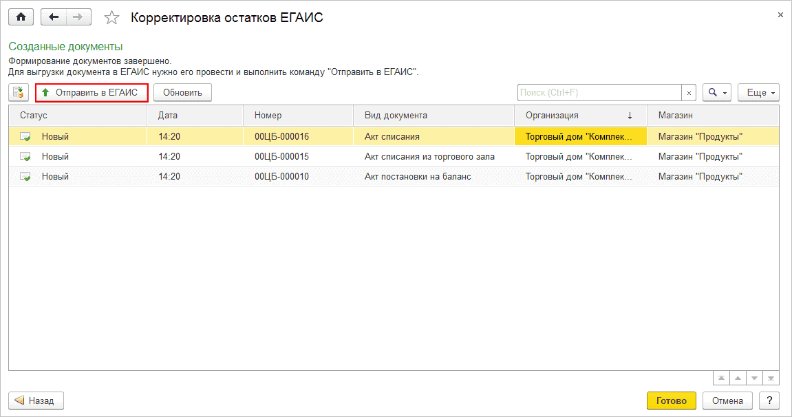 Последним этапом, согласно выявленным расхождениям, будут автоматически сформированы корректирующие документы, которые можно передать в ЕГАИС.