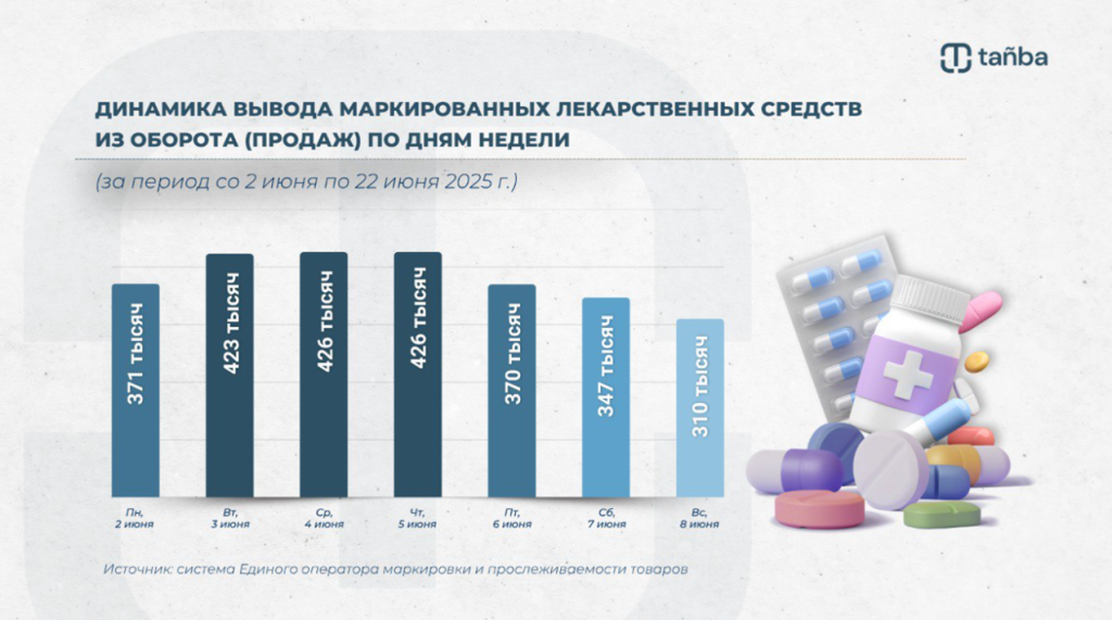 Согласно данным системы Единого оператора маркировки и прослеживаемости товаров Tañba, спрос на лекарства имеет ярко выраженный недельный цикл: