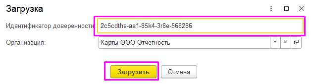 В открывшемся окне укажите Идентификатор доверенности (GUID), выберите организацию и нажмите кнопку «Загрузить»: