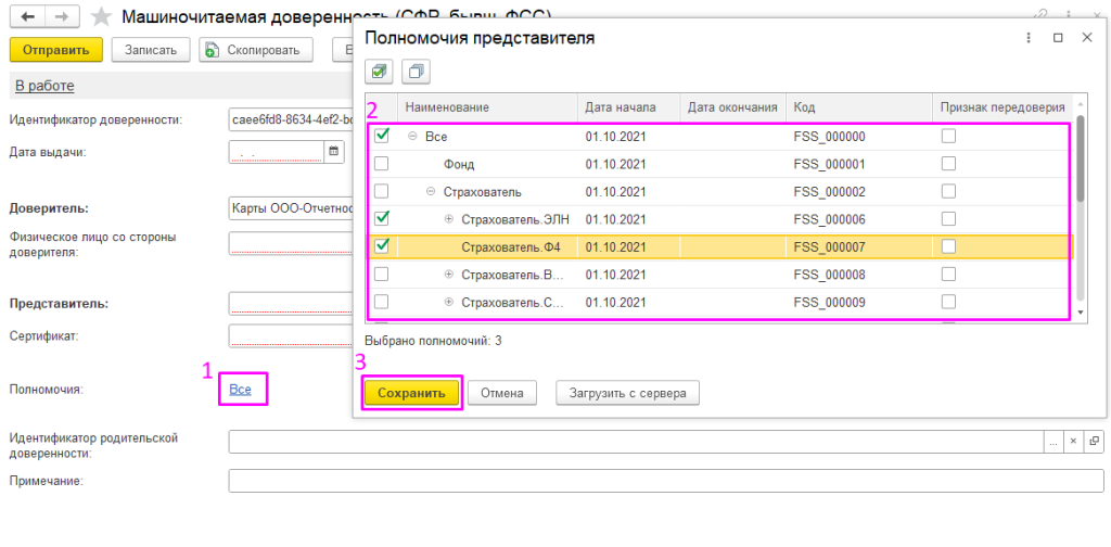 В строке Полномочия есть возможность выбрать полномочия для представителя. По умолчанию выбраны все полномочия. Для настройки в строке Полномочия нажмите гиперссылку «Все» (1). Справочник полномочий представителя уточнён по типам и имеет иерархическую структуру. Выберите желаемые полномочия из списка (2) и нажмите кнопку «Сохранить» (3):