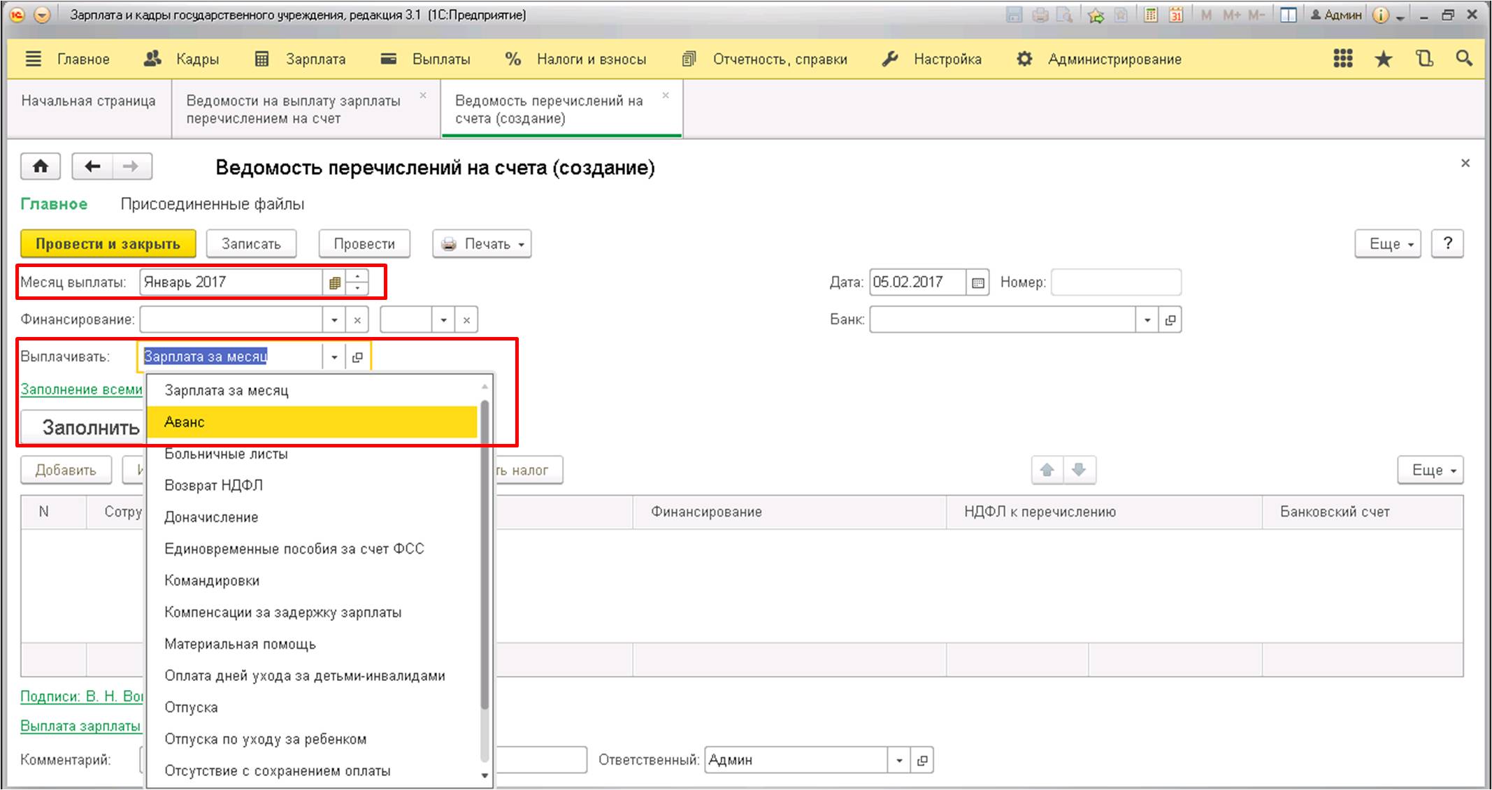 С помощью нажатия на кнопку «Заполнить» происходит заполнение ведомости только теми сотрудниками, у которых был указан вариант перечисления аванса на банковский счёт.