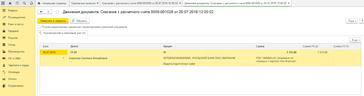 Отражение в 1С операций при покупке по корпоративной карте