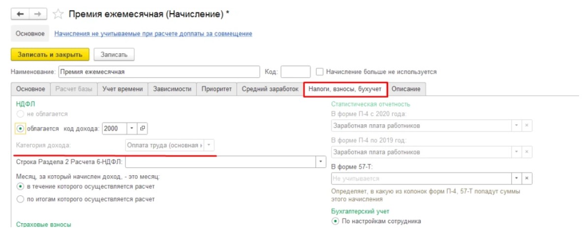 В конфигурации «1С:БП» начисление «Премия» находится под кодом 2002. Категория данного дохода располагается в «Прочие доходы от трудовой деятельности».