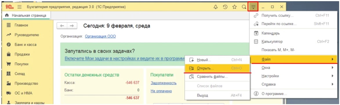 Следующим шагом будет переход в «1С:Предприятие 8» и открытие помощника выгрузки. Необходимо пройти путь «Сервис и настройки» – «Файл» – «Открыть».
