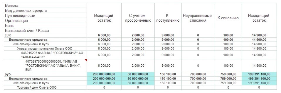 Группировка баланса - параметры группировки в платежном календаре включают: валюту, тип денежных средств, пул ликвидности, организацию, банк, банковский счет / денежные средства. При необходимости вы можете отключить некоторые группировки или изменить их порядок.