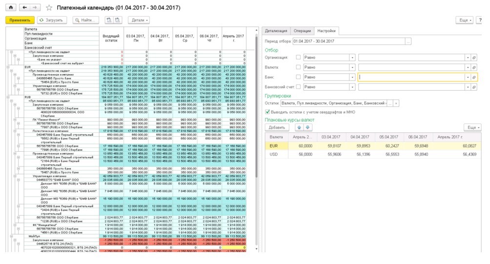 - настраивать свернутые данные по планируемым платежам и остаткам денежных средств вперед на неделю/месяц/квартал/год и т.д.