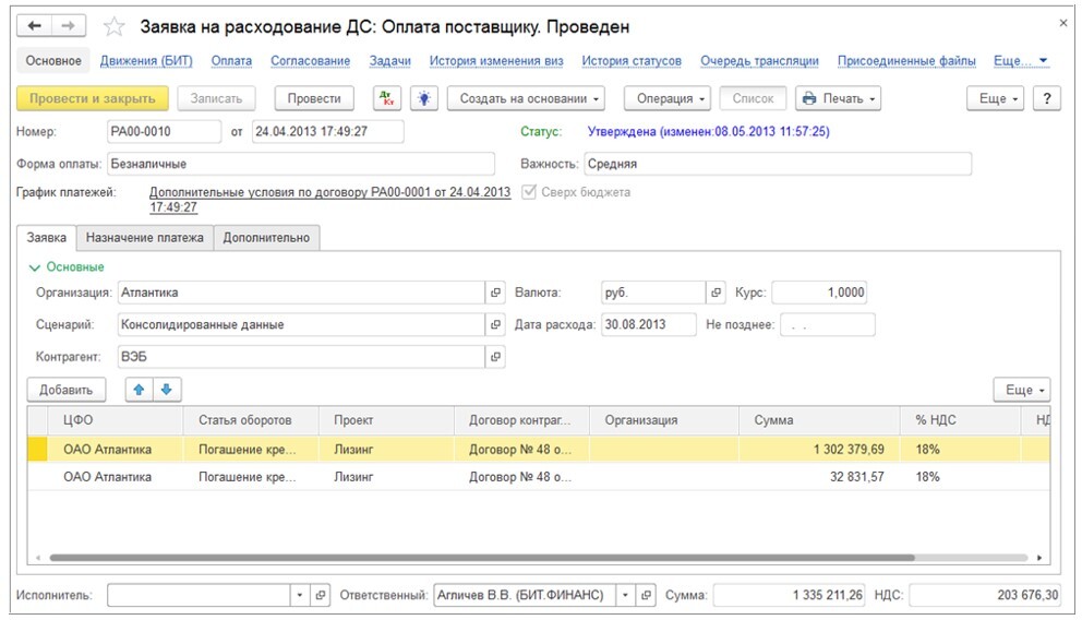 - совершить частичную оплату по заявке, разделив сумму заявки по датам платежа и нескольким банковским счетам/кассам.