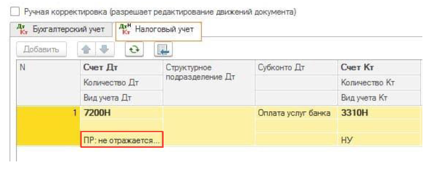 Если «Вид учета» имеет значение «НУ» и у статьи затрат не установлен признак «Принимается к налоговому учету», то будут сформированы проводки по «ПР»