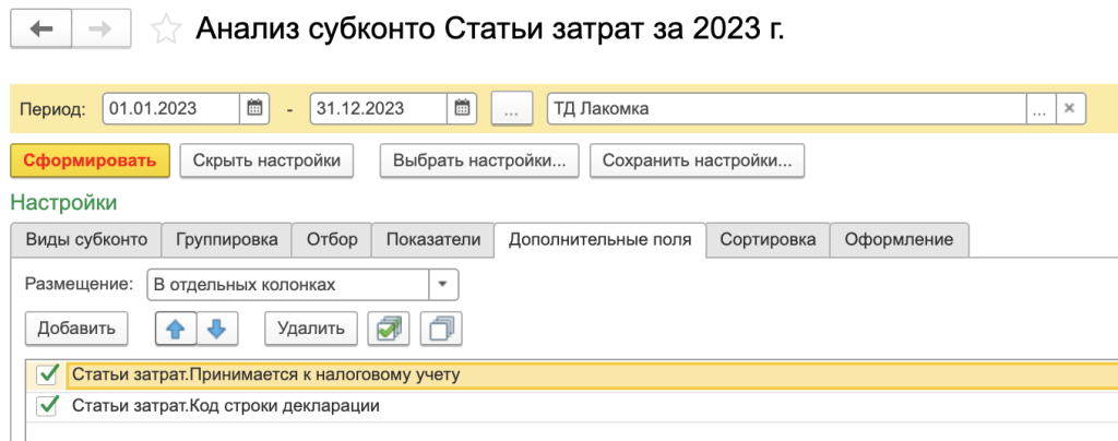 В настройках укажите следующий вид субконто для статей затрат и доходов, а также дополнительные поля в отдельной колонке: