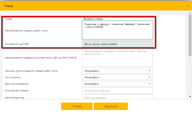11. После выбора товарной позиции автоматически заполнятся поля Наименование товаров, работ, услуг и Составной код ГСВС. В качестве наименования товара система автоматически укажет название кода ТН ВЭД, то пользователь может самостоятельно изменить значение и указать наименование товара по данным своего учета (кроме подакцизных товаров).