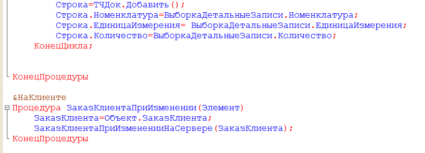 Напишем процедуру обработчик выбора Заказа клиента, которая заполнит реквизиты документа Реализация товаров.