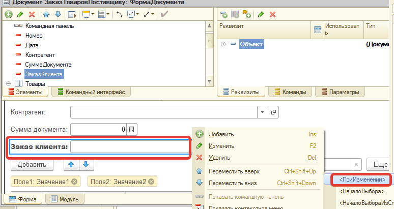 Напишем обработчик события при изменении реквизита Заказ клиента.