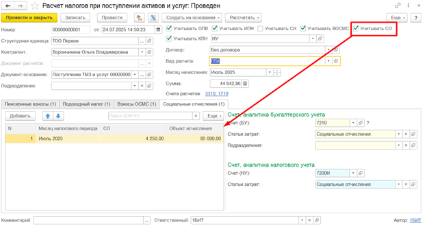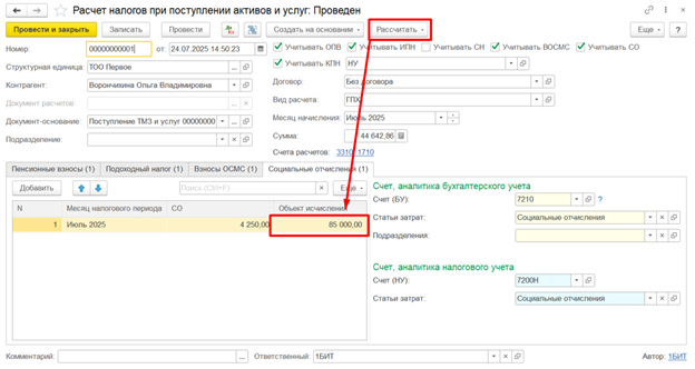 Расчет суммы СО выполняется одновременно с другими взносами и налогами по кнопке Рассчитать и сумма отчислений отражается на вкладке Социальные отчисления.