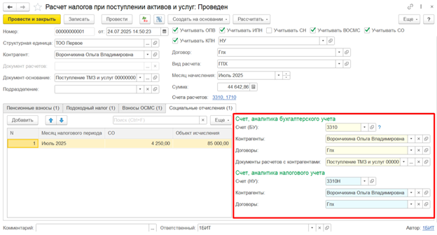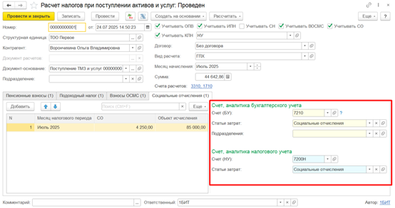 Социальные отчисления по договору ГПХ рассчитываются в документе Расчет налогов при поступлении активов и услуг, который можно ввести на основании документа поступления или через раздел Зарплата – Налогообложение.