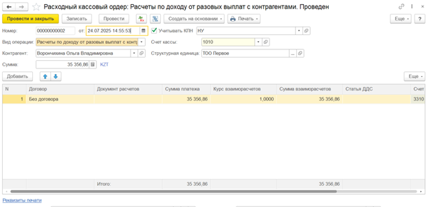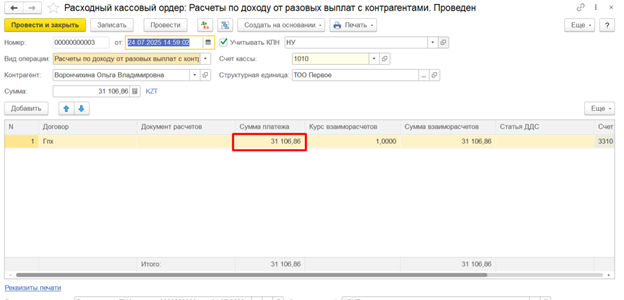 При создании документа выплаты по договору ГПХ, например РКО, на основании документа Расчет налогов при поступлении активов и услуг сумма к выплате рассчитывается как сумма поступления за минусом суммы ОПВ, ИПН и ВОСМС. Сумма социальных отчислений не влияет на сумму выплаты физическому лицу по договору ГПХ.