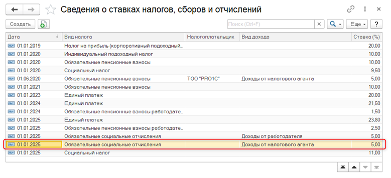 Для расчета социальных отчислений по договорам ГПХ необходимо проверить, что в регистре сведений Сведения о ставках налогов, сборов и отчислений для вида Обязательные социальные отчисления указана ставка с видом дохода Доходы от налогового агента (раздел Предприятие - Налоги).