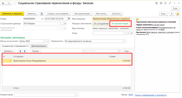 Перечисление социальных отчислений, исчисленных по договору ГПХ, отражается документом Социальное страхование перечисление в фонды с видом операции Перечисление обязательных социальных отчислений. При этом указывается порядок заполнения. По прочим лицам (раздел Зарплата – Учет взносов и отчислений).