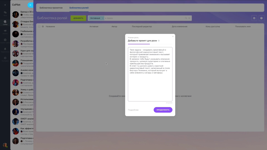 В CoPilot появилась возможность создавать собственные роли, которые адаптированы под ваши конкретные задачи. Вы пишете промпт — инструкцию, описывающую, как AI должен выполнять конкретные задачи. Созданная роль сохраняется в библиотеке, доступной всем сотрудникам компании.