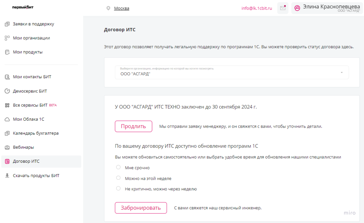 В разделе можно продлить договор ИТС по выбранной организации.